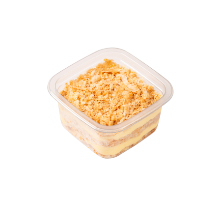 В меру сладкий, с лёгкой кислинкой, кусочками персиков и абрикосовой начинкой. Его основа - натуральный йогурт. Сам десерт удобно расположился на воздушном бисквите.